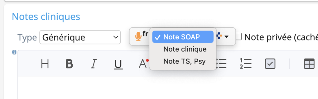 Vous pouvez choisir le type de note produite avant ou même pendant l’enregistrement à l’aide du menu déroulant. Les modèles disponibles sont :