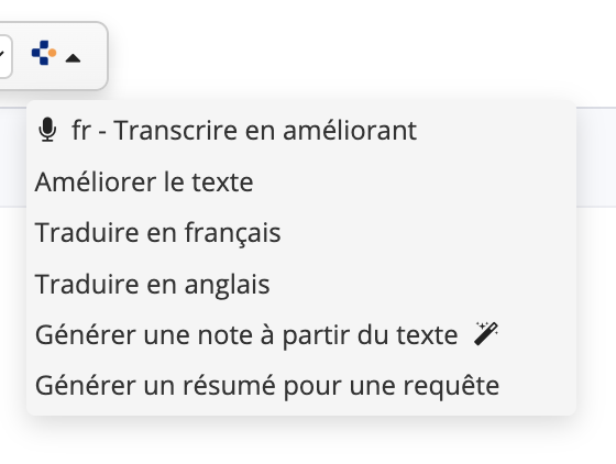 Dans cette boîte à outils, vous trouverez l’option Améliorer le texte . Celle-ci permet d’enrichir le contenu en utilisant un langage de qualité supérieure, rendant le texte plus complet et corrigeant les fautes. Un encadré s’ouvrira afin de vous montrer le texte optimisé. Avec le bouton Remplacer le texte, vous pouvez choisir ce texte rédigé pour remplacer ce qui se trouvait dans la note. Vous pouvez également copier le texte avec le bouton Copier en cochant la case Retirer le formatage avant copie au besoin.