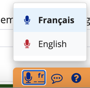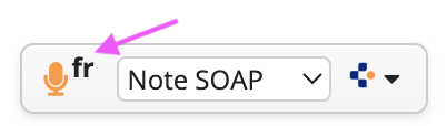 Sofia est bilingue : vous pouvez dicter en français ou en anglais. Pour choisir la langue, utilisez le bouton de langue situé dans la barre d’outils Sofia en bas à droite. Le bouton micro affiche un petit indicateur de couleur pour montrer la langue utilisée pour la transcription :