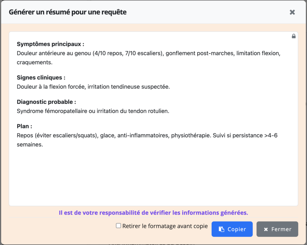 Cette option vous permet de générer un résumé des informations cliniques de la rencontre afin de les copier dans un formulaire pour une requête. Elle peut s’avérer utile, par exemple, si vous devez remplir un formulaire CRDS ou bien une requête en physio. Le texte contenu dans ce résumé est bref et résume l’essentiel de la rencontre. Copiez-le à l’aide du bouton dans le bas afin de le coller dans votre formulaire.