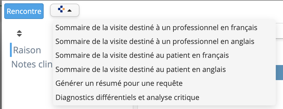 Sommaire de la visite destiné à un professionnel en français, Sommaire de la visite destiné à un professionnel en anglais, Sommaire de la visite destiné au patient en français, Sommaire de la visite destiné au patient en anglais, Générer un résumé pour une requête, Diagnostics différentiels et analyse critique.