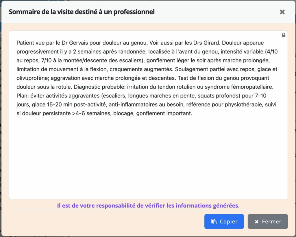Vous pouvez générer un sommaire de la visite destiné à un professionnel, en anglais et en français. Le sommaire généré est axé sur les données cliniques de la rencontre.