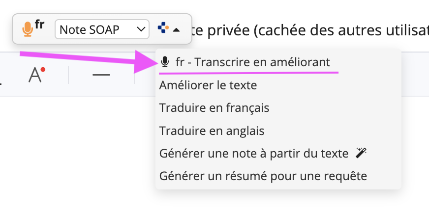 Lorsque vous éditez une rencontre, la boîte à outils Sofia et les options d’enregistrement apparaissent en haut de la note clinique. Pour générer rapidement une note à partir de l’entretien, cliquez sur le micro à gauche : l’IA enregistre la conversation et crée automatiquement la note, après confirmation du consentement du patient.