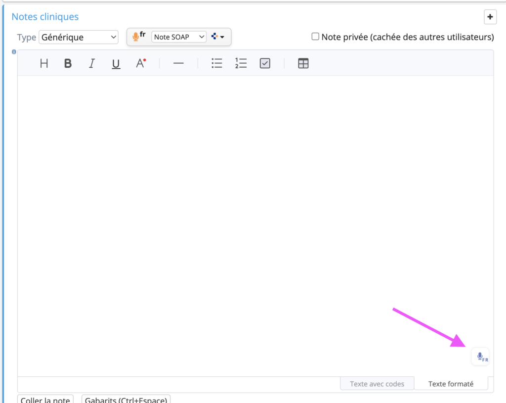 L’outil de génération de note médicale vous permet de créer une note structurée à partir des informations saisies dans ce champ de texte. Vous avez la possibilité d’y inscrire des informations sans structure spécifique ou même de dicter ce que vous souhaitez retrouver dans la note. En cliquant sur le bouton de génération, le contenu sera organisé et structuré selon le modèle de note que vous avez sélectionné (par exemple, SOAP).