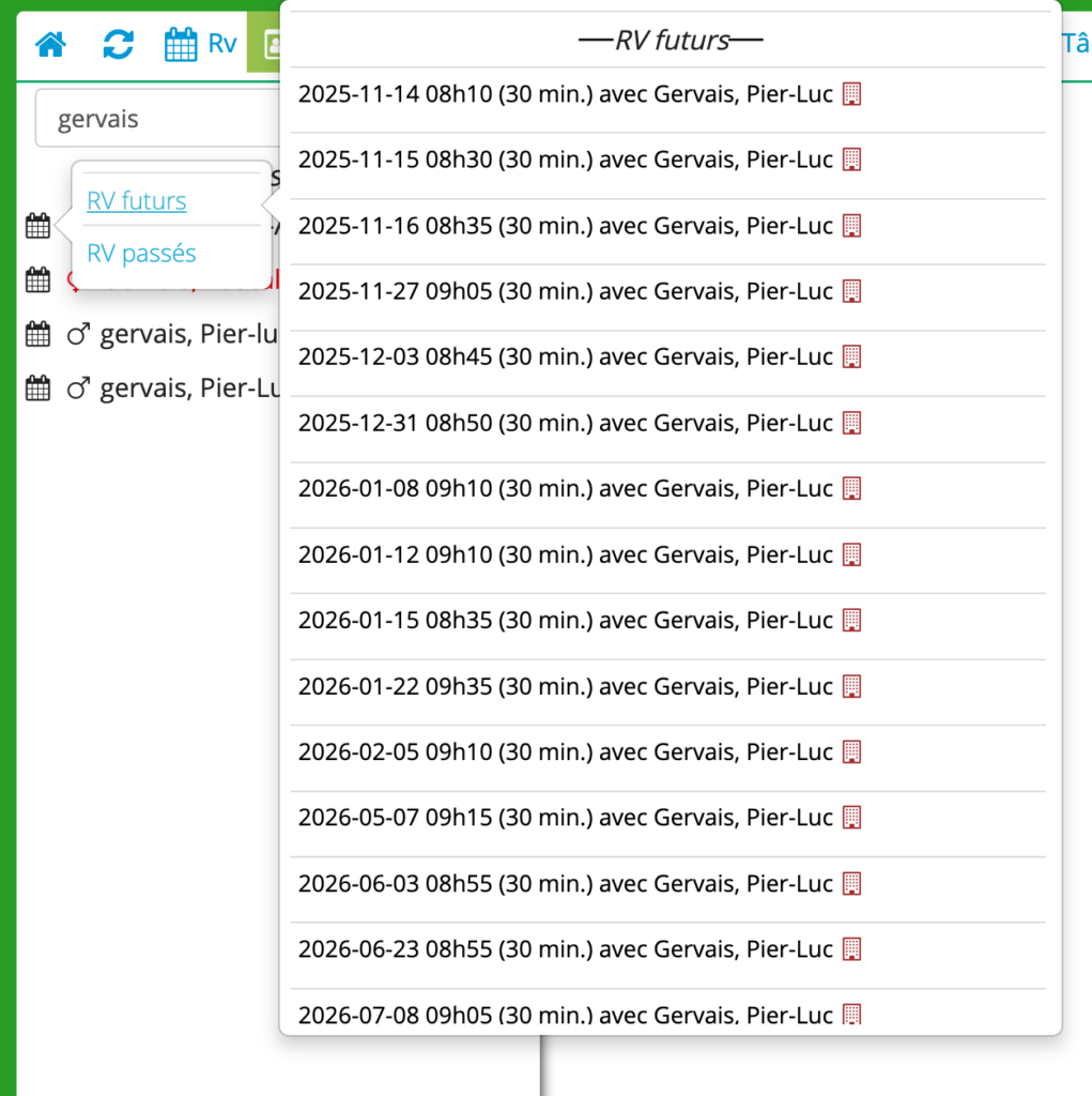 Correction de l’ordre d’affichage : sur l’aperçu des rendez-vous futurs, les RV les plus proches s’affichent maintenant en premier (au lieu des plus éloignés) pour les patients ayant de nombreux rendez-vous futurs